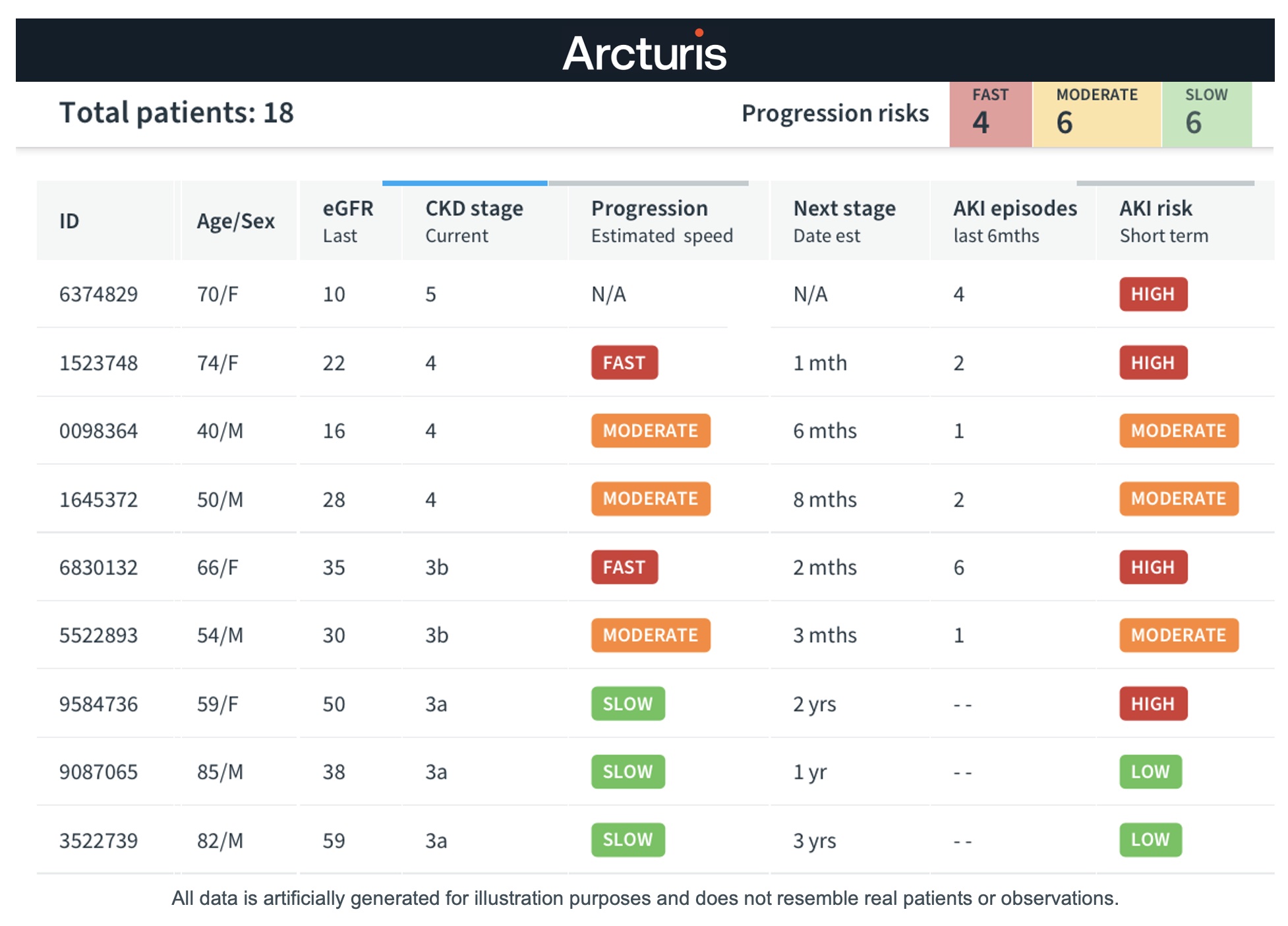 Arcturis’s models learn clinical insights across large sets of de-identified data that comprise tens of thousands of patients and hundreds of millions of observations, covering continuous patient pathways over many years. Our specialised deep neural networks learn disease trajectories, allowing them to discover patients at the highest risk of CKD progression and reveal personalised risk factors for poor prognosis.