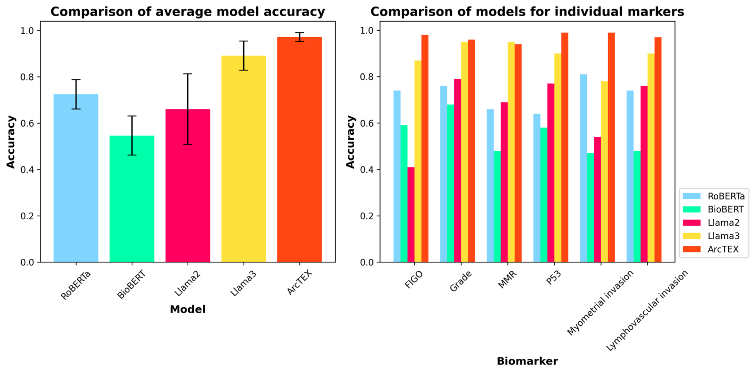 In comparison to other available transformer-based language models, such as RoBERTa, BioBERT, or large language models (LLMs) such as Meta’s Llama2 and Llama3 models, ArcTEX has shown superior performance in biomarker extraction. In the figure below, we can see the average overall accuracies of the aforementioned models compared to ArcTEX on the left, with the performance across specific markers displayed on the right. In addition to greater overall performance, ArcTEX also provides insights into the model performance. Unlike with LLMs, for each evaluated free text report, ArcTEX will generate scores based on its confidence that it has identified the correct value. By exploring these confidence scores, reports can be automatically identified which have a risk of having been misclassified. These reports can be flagged for either manual review or excluded from the analysis, resulting in an overall accuracy increase.